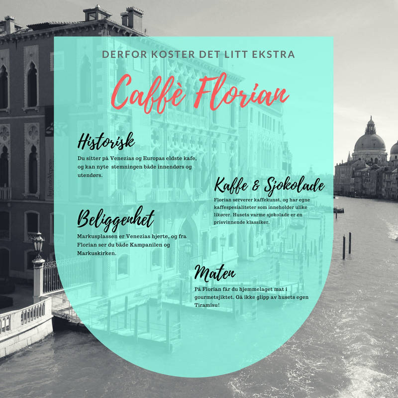 Denne kafeen/restauranten er hovedsynderen som har plassert Venezia på spreng-reisekassa-kartet. Mange får bakoversveis når regningen for en brus og en kaffe kommer på over 300 kroner. Forklaringen på de høye prisene får du her.