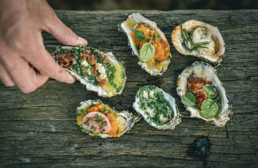 Med båten Manøpigen – som raskt kan forvandles til et landgående kjøretøy – kjørte Arne og Stig rett ut på østersbankene. Her ble østersen plukket rett fra sandbunnen ved lavvann.