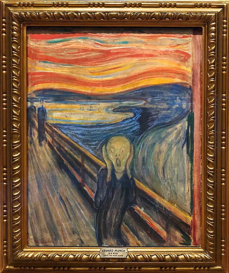 Ekebergåsen var et populært sted for Kristianias befolkning. Går du opp Valhallveien, vil du kunne kjenne igjen utsikten i «Skrik» der du ser Bjørvika på høyre side. Dette fjordlandskapet er like mye et abstrahert, indre landskap, og Munch selv skal ha sagt dette om bildet: Jeg gikk en aften utover en vei – på den ene side lå byen og fjorden under meg. Jeg var trett og syk – jeg stod og så utover fjorden. Solen gikk ned – skyene farvedes røde – som blod. Jeg følte som et skrik gjennom naturen – jeg syntes å høre et skrik. Jeg malte dette bilde – malte skyene som virkelig blod. Farvene skrek.