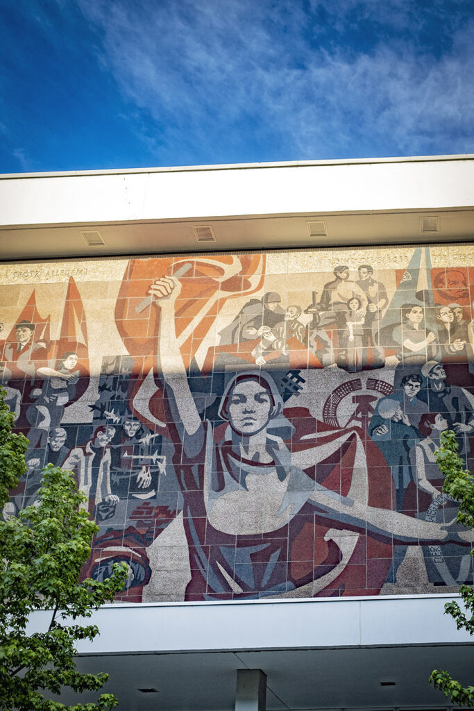 Vi skuer opp på «Der Weg der roten Fahne» (de røde fanes vei) fra 1969. Det preger en hel vegg i Dresdens kulturpalass på Altmarkt (det gamle markedet i hjertet av byen).