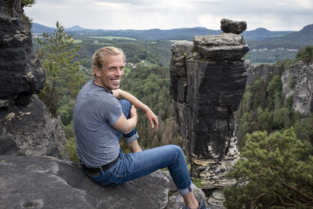 Vi befinner oss blant de underlige fjellformasjonene ovenfor kurstedet Rathen, i området Sächsiche Schweitz. Solen stråler, som den også gjorde den dagen Thomas dro ut av Dresden i tog vel en halvtime unna.