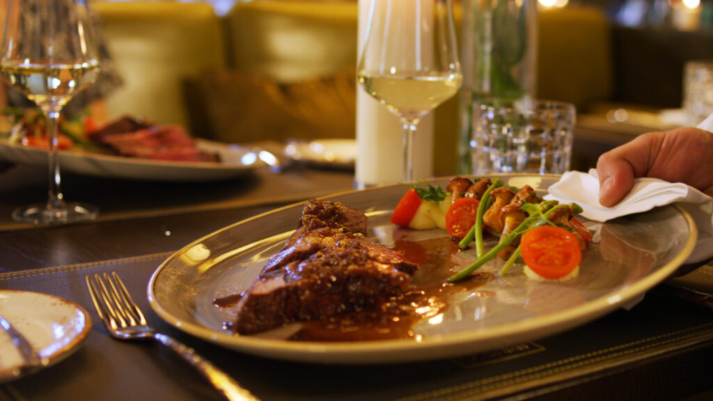 Ved middagsbordet samme kveld serveres vi mixed grill med grønnsaker og vilt fra slottets egen eiendom. Utover den egenproduserte maten serverer kjøkkenet også lokalprodusert vin, noe som gjør hele opplevelsen både velsmakende og kortreist.